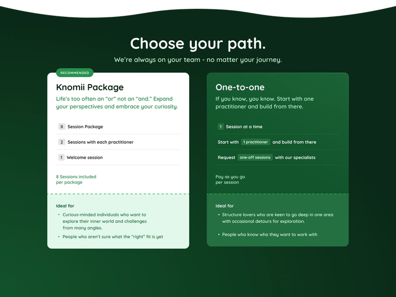 Knomii tackles this issue head-on. As coaches, therapists, mentors, and (importantly!) humans who've experienced this ourselves, we get it. You need easy access to the right support, especially since your goals and needs evolve over time.